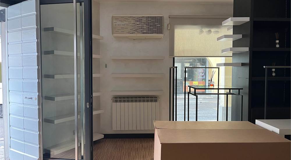 Negozio/ufficio di 57 mq in pieno centro, posizionato in angolo sulle due vie principali e con porticato antistante le due vetrine.